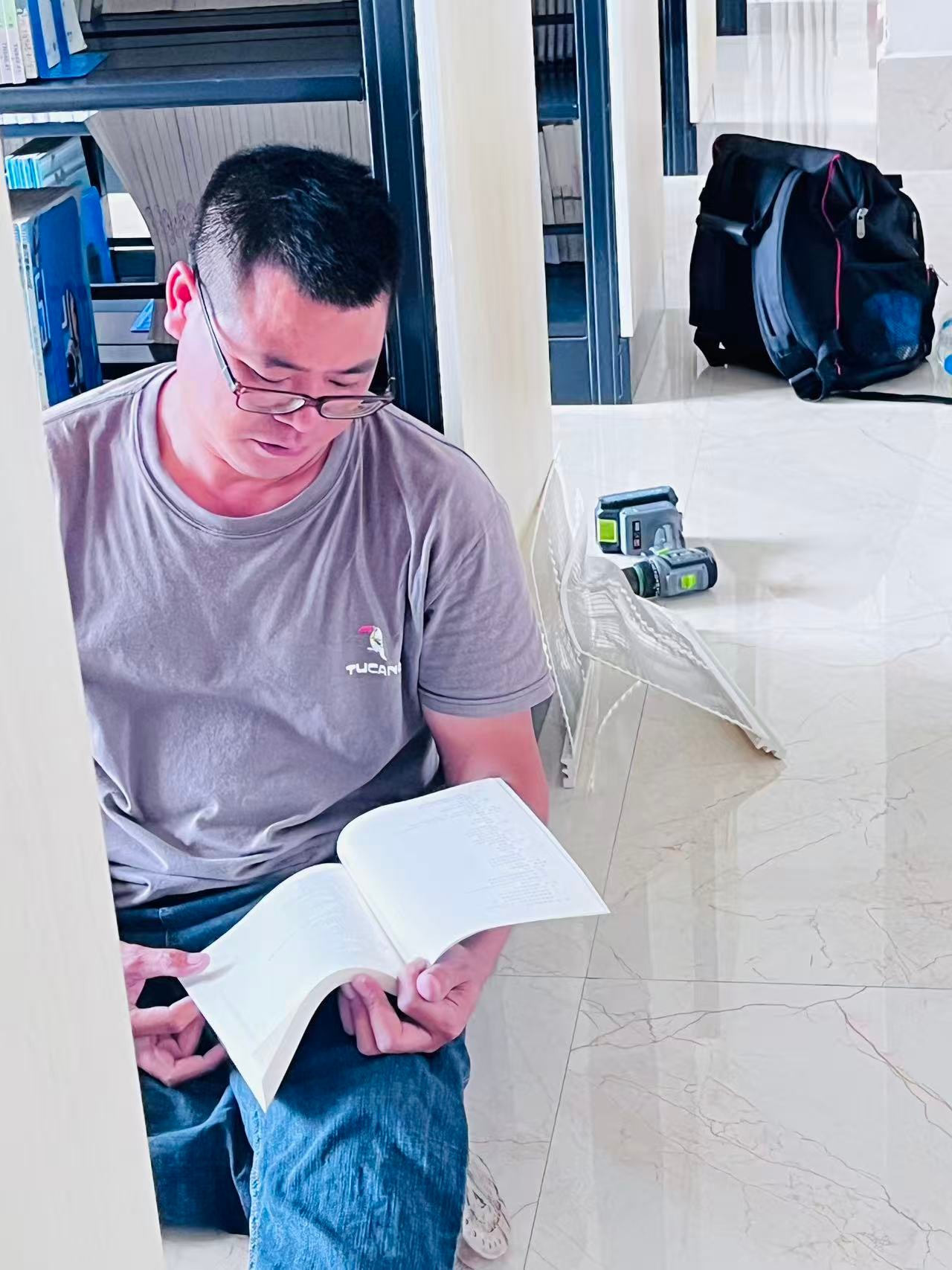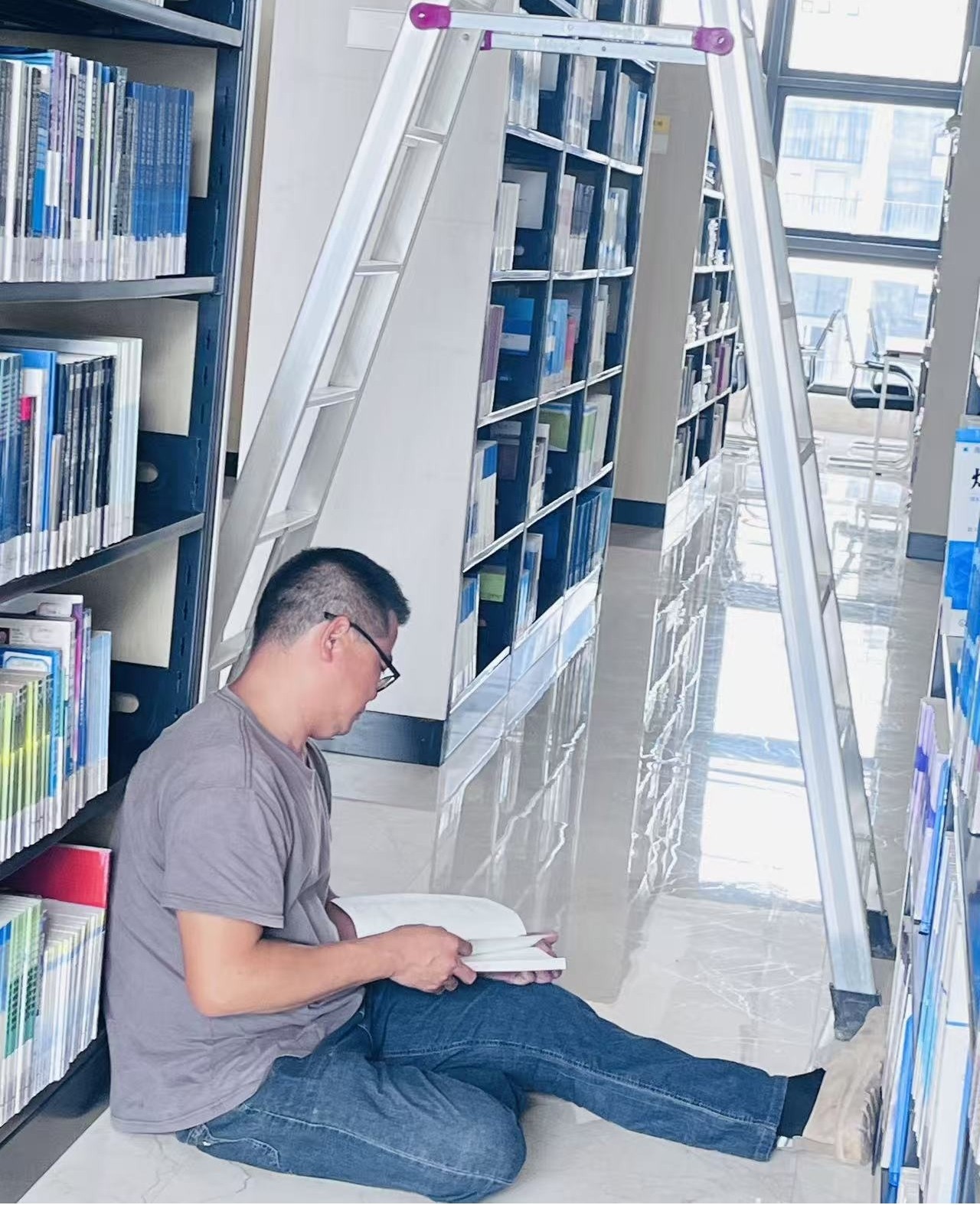 在窗明几净的图书馆里,一架白色的人字梯静静倚在书架旁,阳光透过玻璃窗洒在光洁的地面上,映出层层书架的倒影。一位读者席地而坐,背靠着满载书籍的书架,手中摊开一本厚重的书,神情专注得仿佛与周围的世界隔绝——这张照片定格的,正是阅读最本真的模样:无需刻意的仪式,只需一颗沉静的心,便能在文字的世界里自由徜徉。