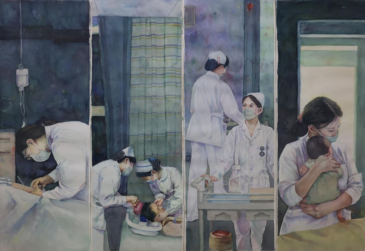 瞿杨虹《白衣天使展巾帼风采》27cm*75cm*4 纸本水彩