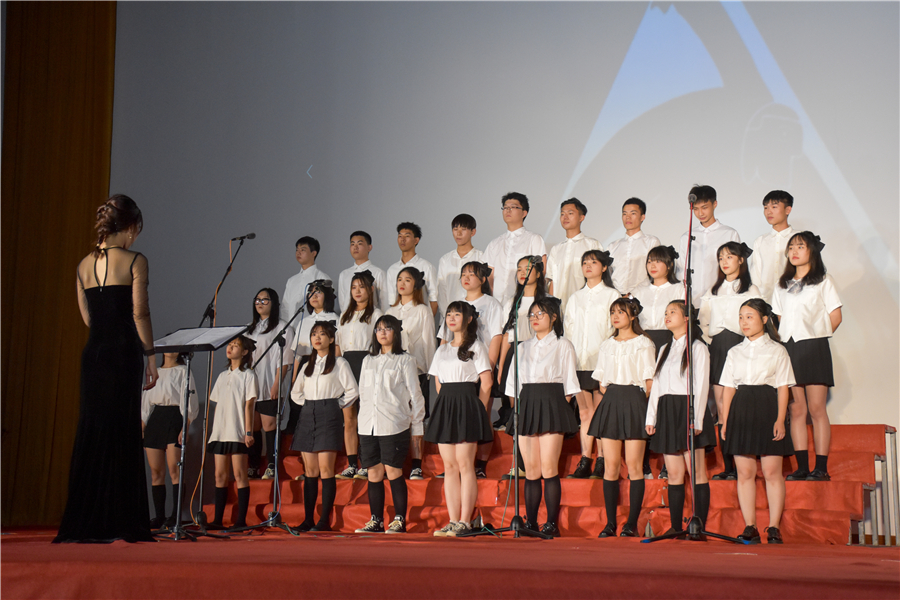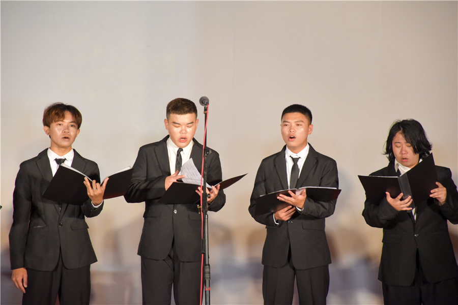饶承硕、高菲等同学表演女声小组唱苗族歌曲《簸萁上的麻雀》,让同学们感受到:一朵花是渺小的,但聚成一树,一树开花就成了春天;一个人是渺小的,但千万个你我在一起,便成一个民族。
