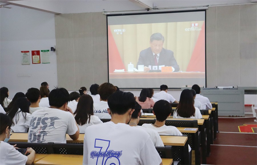 5月10日上午,庆祝中国共产主义青年团成立100周年大会在北京人民大会堂隆重举行。中共中央总书记、国家主席、中央军委主席习近平发表重要讲话。我校校党委书记张阳,党委副书记、副校长彭仁,党委副书记韦静月,副校长黄侃明,学校团委及分团委教师、学生团员代表,各基层党组织师生代表共150人于西校区伦理楼107收听收看大会实况。