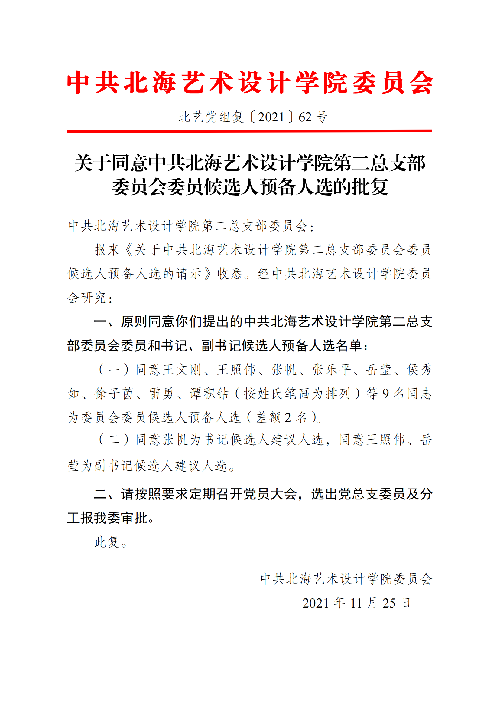 转发学校党委《关于同意中共北海艺术设计学院第二总支部委员会委员候选人预备人选的批复》