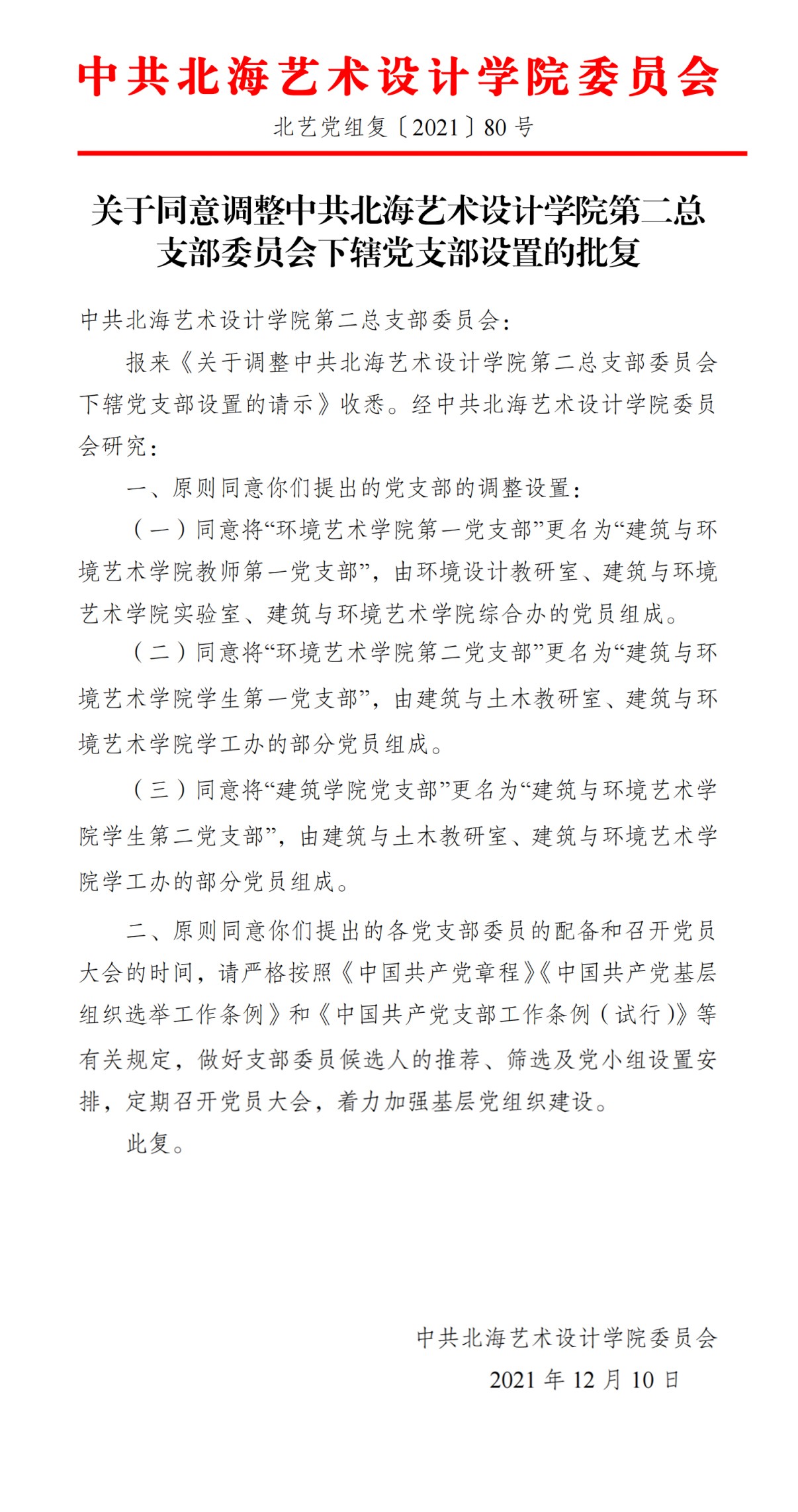 转发学校党委《关于同意调整中共北海艺术设计学院第二总支部委员会下辖党支部设置的批复》