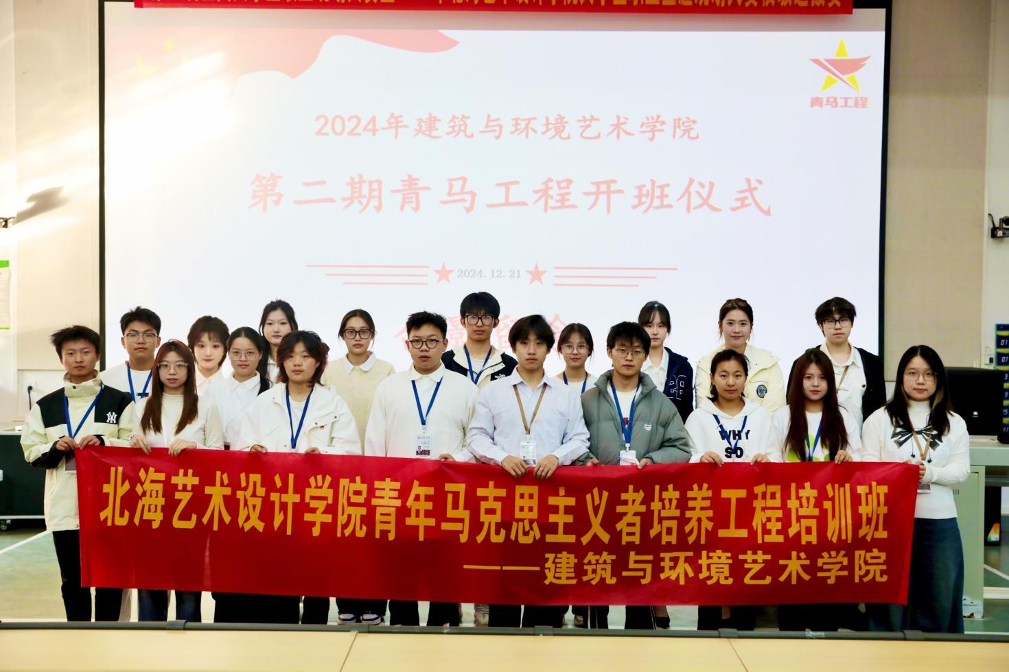 2024年12月21日,由北海艺术设计学院建筑与环境艺术学院分团委学生会承办的第一期青马工程结业仪式以及第二期青马工程开班仪式在公德楼107隆重举行。莅临本次活动的嘉宾有建筑与环境艺术学院党总支副书记曲玥,建筑与环境艺术学院总支委员、副院长张乐平,学生第一党支部书记刘杰,建筑与环境艺术学院学生第二党支部书记、分团委副书记陈宣辰,建筑与环境艺术学院分团委书记赵晓盼。