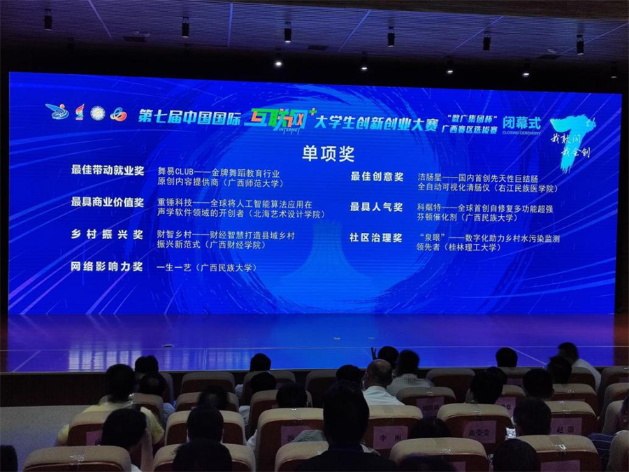 2021年7月18—21日,第七届中国国际“互联网+”大学生创新创业大赛广西赛区选拔赛现场总决赛在广西财经学院举行。经过激烈角逐,我校斩获金奖1项,银奖2项,铜奖17项。其中,金奖项目《重锤科技--全球将人工智能算法应用在声学软件领域的开创者》在高教主赛道成长组位列全区第一,兼获“最具商业价值奖”单项奖,并顺利挺进国赛!此外,我校推荐选送的两个项目《里季--为中国品牌代言》和《惊喜“八桂”与“坭”同行》获得银奖。