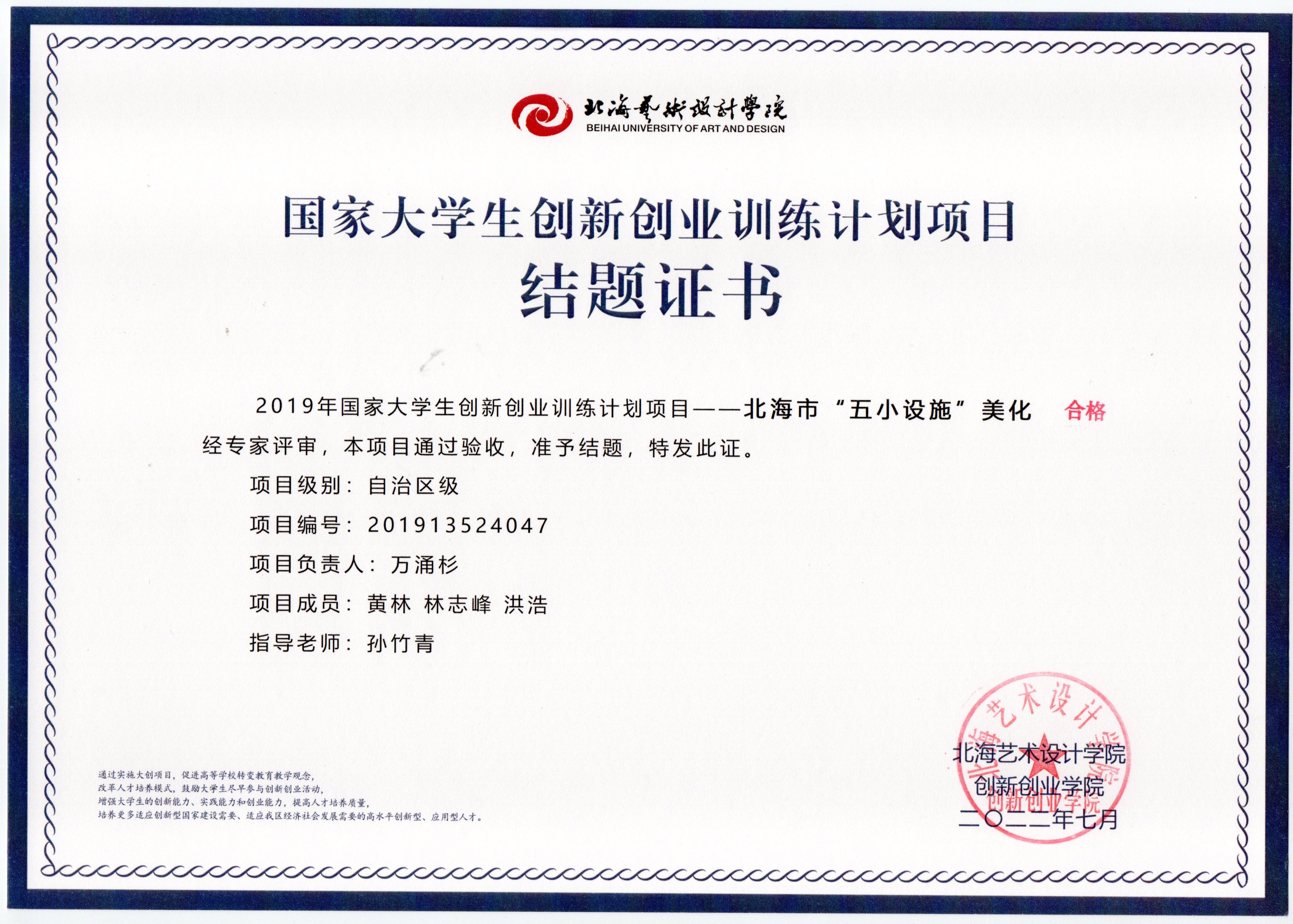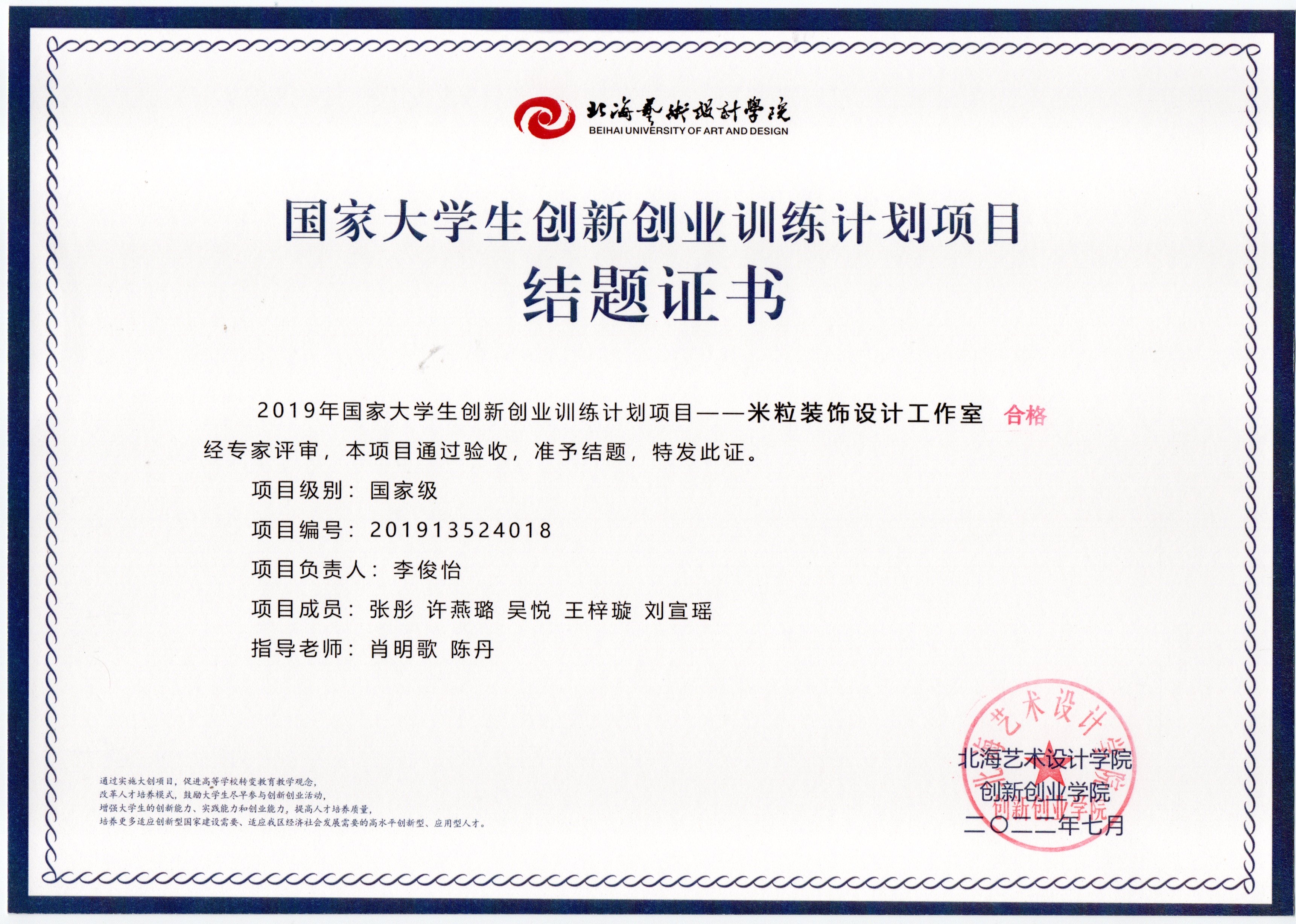 2022年大创项目结题证书(2019立项)