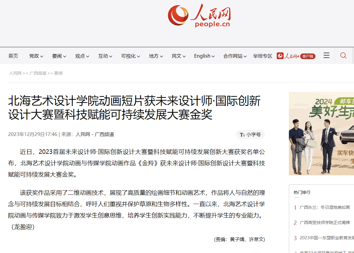 人民网:北海艺术设计学院动画短片获未来设计师·国际创新设计大赛暨科技赋能可持续发展大赛金奖