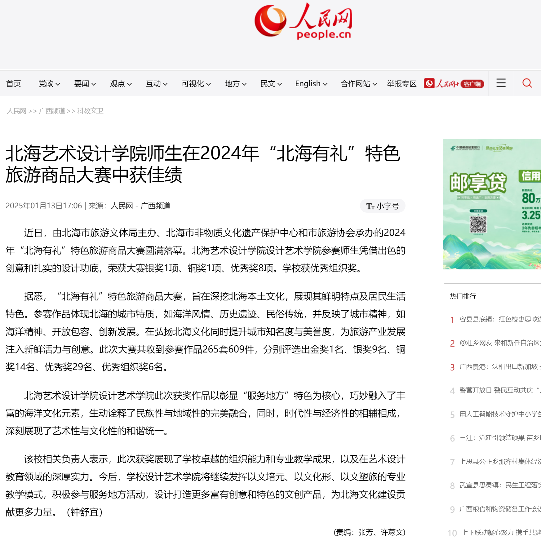 人民网:北海艺术设计学院师生在2024年“北海有礼”特色旅游商品大赛中获佳绩