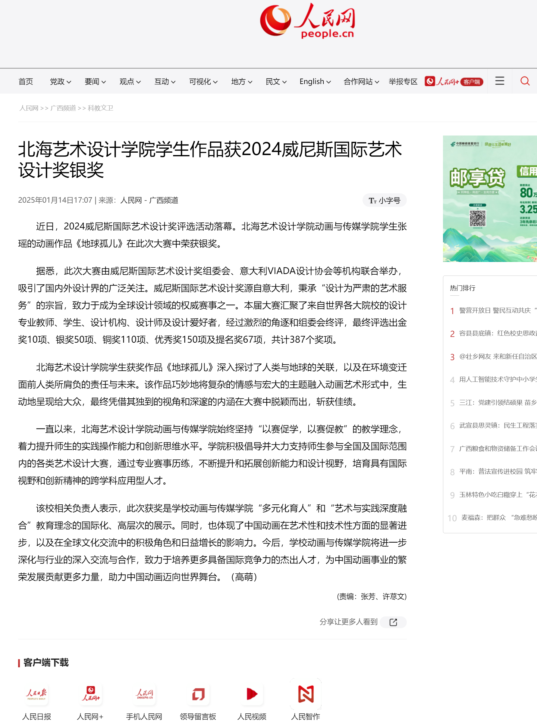 人民网:北海艺术设计学院学生作品获2024威尼斯国际艺术设计奖银奖