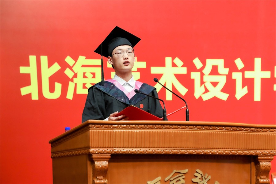 浓浓母校情,悠悠学子心。产品设计专业1902班学生刘恩朋作为优秀毕业生代表发言,他回顾四年成长与收获,感恩母校与老师的辛勤培育和悉心教导,今后将怀揣更高理想,自立自强,浇筑广厦,奋勇前行乘风破浪,秉承“道德”校训为国图强。