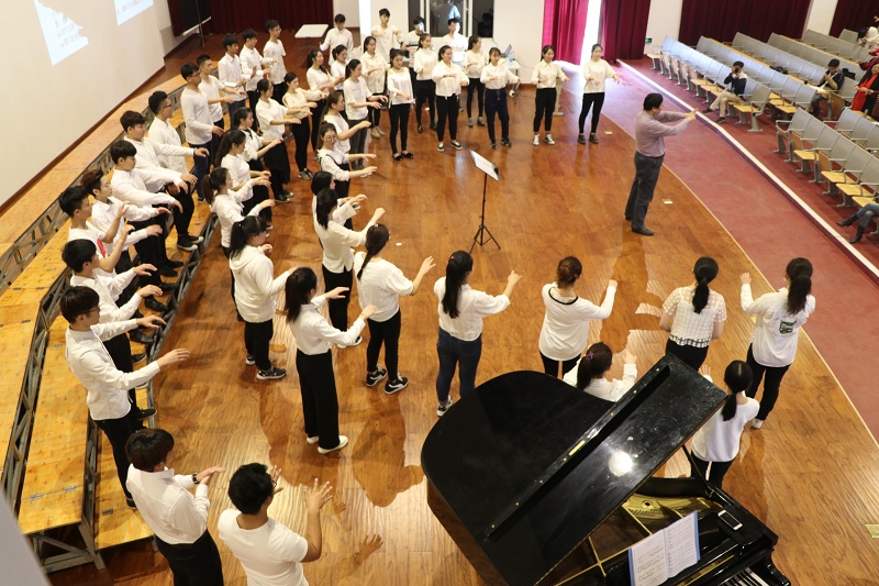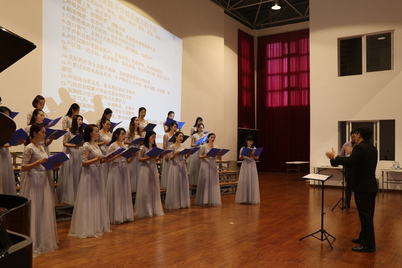 2017年3月11日,任宝平教授莅临我院讲学,对我院教育学院合唱团及北海各大合唱团进行为期两天的讲学指导。讲学前,任宝平教授带领我院教育学院的同学们进行清嗓热身训练。任宝平教授还对我院教育学院合唱团曲目《菊花台》的作品特征、演奏要点、处理方法等方面进行了详细的解说。授课中任宝平教授近身亲自指挥,手把手耐心细致地指导同学们。