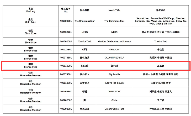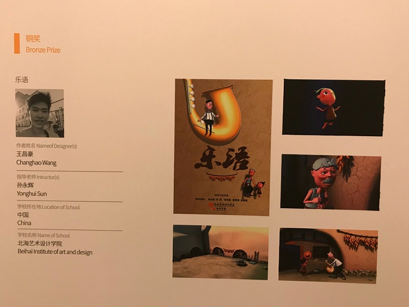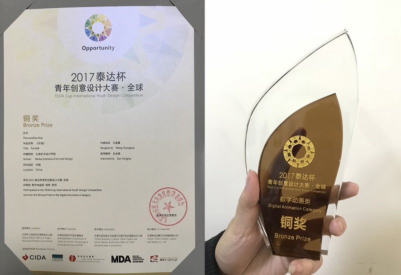 2017年12月13日,2017年“泰达杯”全球青年创意设计大赛颁奖典礼在天津举行,我校动画学院孙永辉、李宗毅、潘青青、武鹏程、刘涛老师指导,由2015级动画专业学生创作的动画短片《乐语》获得铜奖。