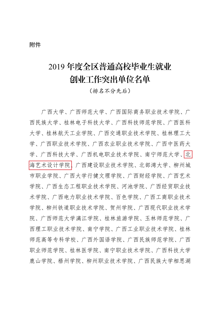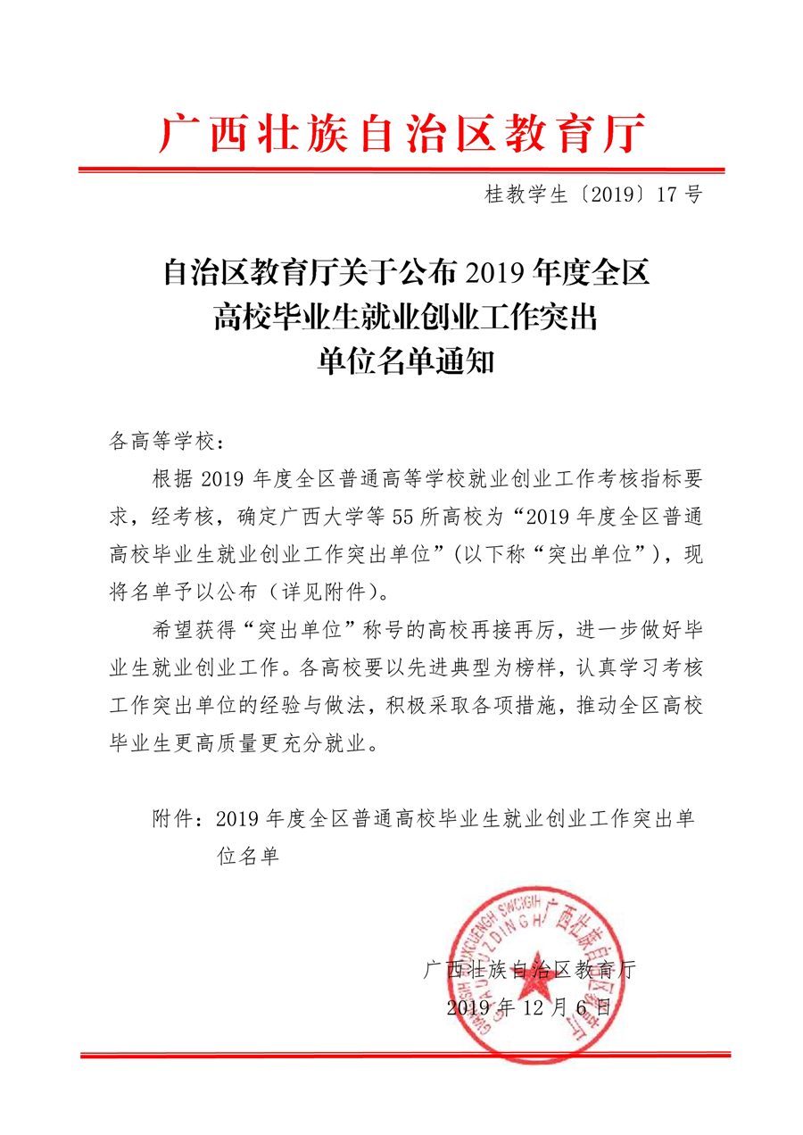 日前,根据广西壮族自治区教育厅下发的《关于公布2019年度全区高校毕业生就业创业工作突出单位名单通知》文件,我校荣获“2019年度全区高校毕业生就业创业工作突出单位”。
