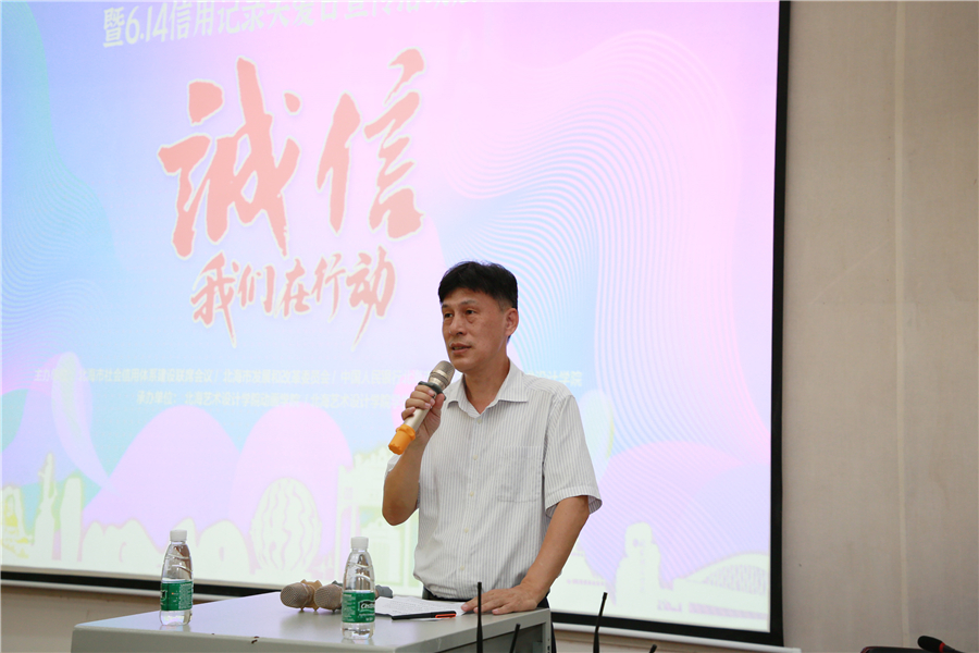 6月12日下午16时,由北海市社会信用体系建设联席会、北海市发展和改革委员会、中国人民银行北海市中心支行携手北海艺术设计学院举办的2020年北海市“征信·创城杯”诚信主题漫画创作比赛暨6.14信用记录关爱日宣传活动启动仪式在我校西区伦理楼107隆重举行。中国人民银行北海市中心支行副行长徐 斌,北海市发展和改革委员会副调研员林超霞,北海市发展和改革委员会信用督导科科长杨禾泽,中国人民银行北海市中心支行征信管理科科长毛卫东,我校副校长、党委副书记彭仁,副校长邱杰及二级学院、学工处相关领导,北海各银行征信业务牵头部门负责人出席了启动仪式。