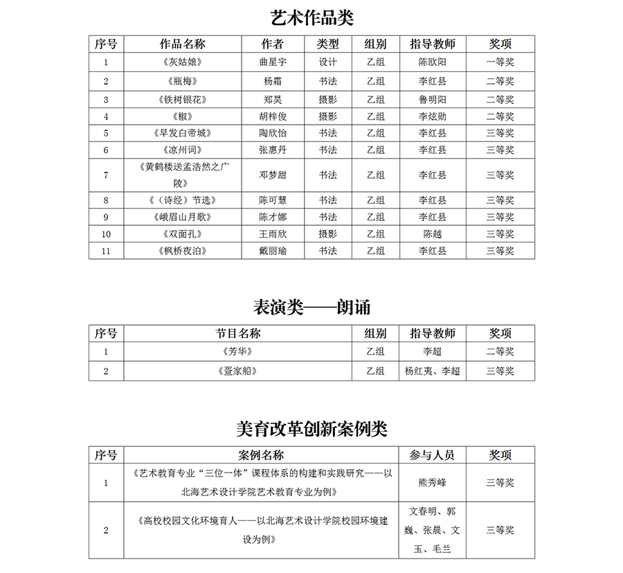 近日,由广西壮族自治区教育厅主办的广西第六届大学生艺术展演活动圆满落下帷幕。在本次展演中,我校选送的作品共获得16个奖项,其中艺术表演类朗诵作品获二等奖1项、三等奖1项;艺术作品获一等奖1项、二等奖3项、三等奖7项;美育创新改革案例获三等奖2项,学校获优秀组织奖。本次参赛成绩是我校参加自治区大学生艺术展演以来的最好成绩。