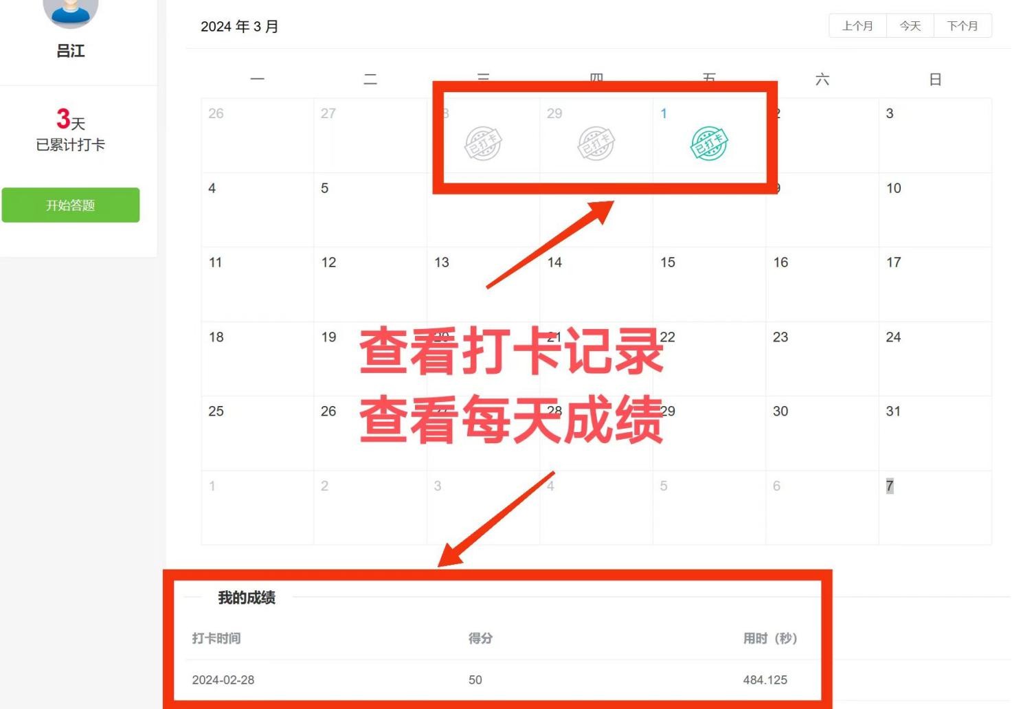 参赛者在竞赛期,每人每天仅限打卡一次(每次打卡任务共 10道题,每题10分,且为随机抽取)答题时间为30分钟,提交试卷后,系统自动记录答题分数、时长和累积打卡天数。