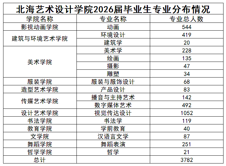 为了提高人职匹配度,请用人单位详阅《北海艺术设计学院2026届毕业生专业分布情况》