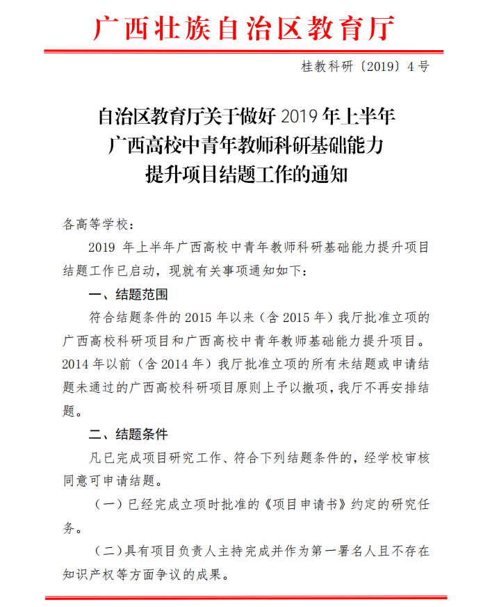 自治区关于教育厅关于做好2019年上半年广西高校中青年教师科研基础能力提升项目结题工作的通知