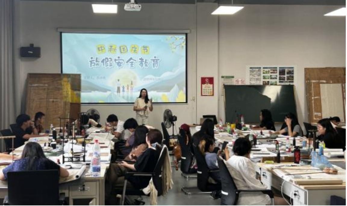 为切实做好中秋、国庆假期学生安全工作,强化学生安全意识,筑牢假期安全防线,2025年中秋、国庆假期前夕,美术学院组织开展安全教育主题班会,会议围绕离校返校交通、人身财产、防火防盗、防诈骗、防溺水、出行旅游等六大模块进行,各班级辅导员主持会议,全体学生参加。