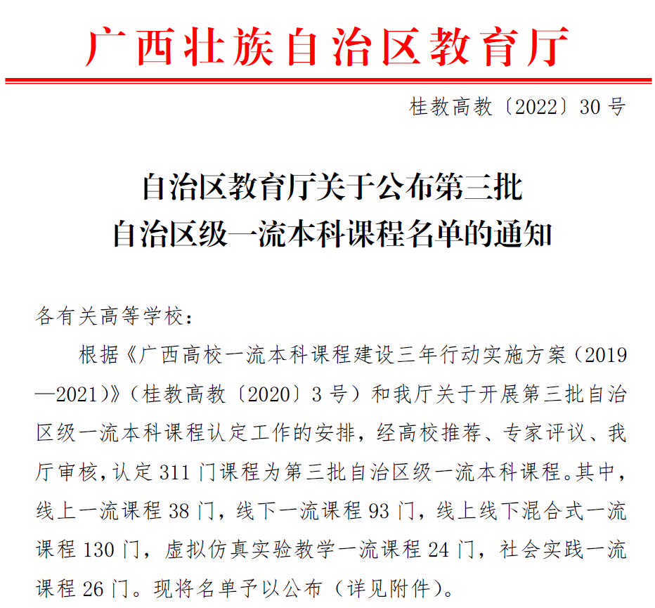 近日,根据《自治区教育厅关于公布第三批自治区级一流本科课程名单的通知》(桂教高教〔2022〕30号),我校李林平负责的 《广告设计》课程认定为自治区级线下一流本科课程、陶立阳负责的《动画项目创作》课程认定为自治区级社会实践一流本科课程。