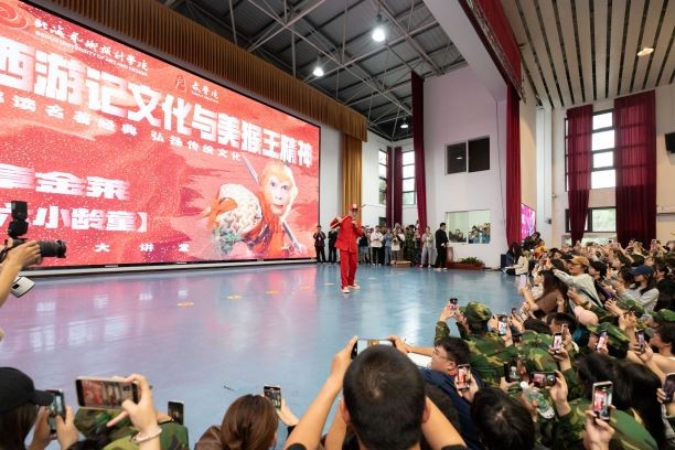 2024年12月5日,一级演员、中国著名表演艺术家六小龄童——章金莱老师受邀来到北海艺术设计学院,为全校师生带来主题为《〈西游记〉文化与美猴王精神》的精彩讲座。本次讲座由文学院主办,常务副院长梁镨文主持。