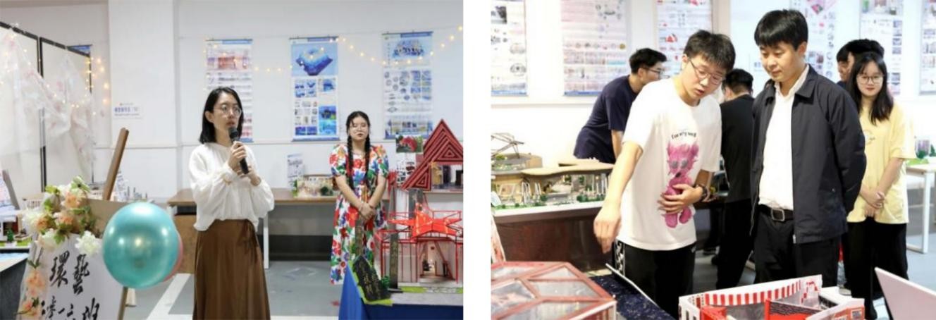 在设计展中,各班专业老师对本班情况进行介绍,并表示:在本次展览设计中锻炼了同学们多方面的能力——平面设计、立面构思、空间造型设计等,且同学们的作品极大程度上贴合了市场的需求,将所学内容落到实处。在每组同学阐述自己的设计理念后,老师从造型、灯光、色彩搭配等方面进行点评与总结,使得各展厅方案从整体达到更好的效果。
