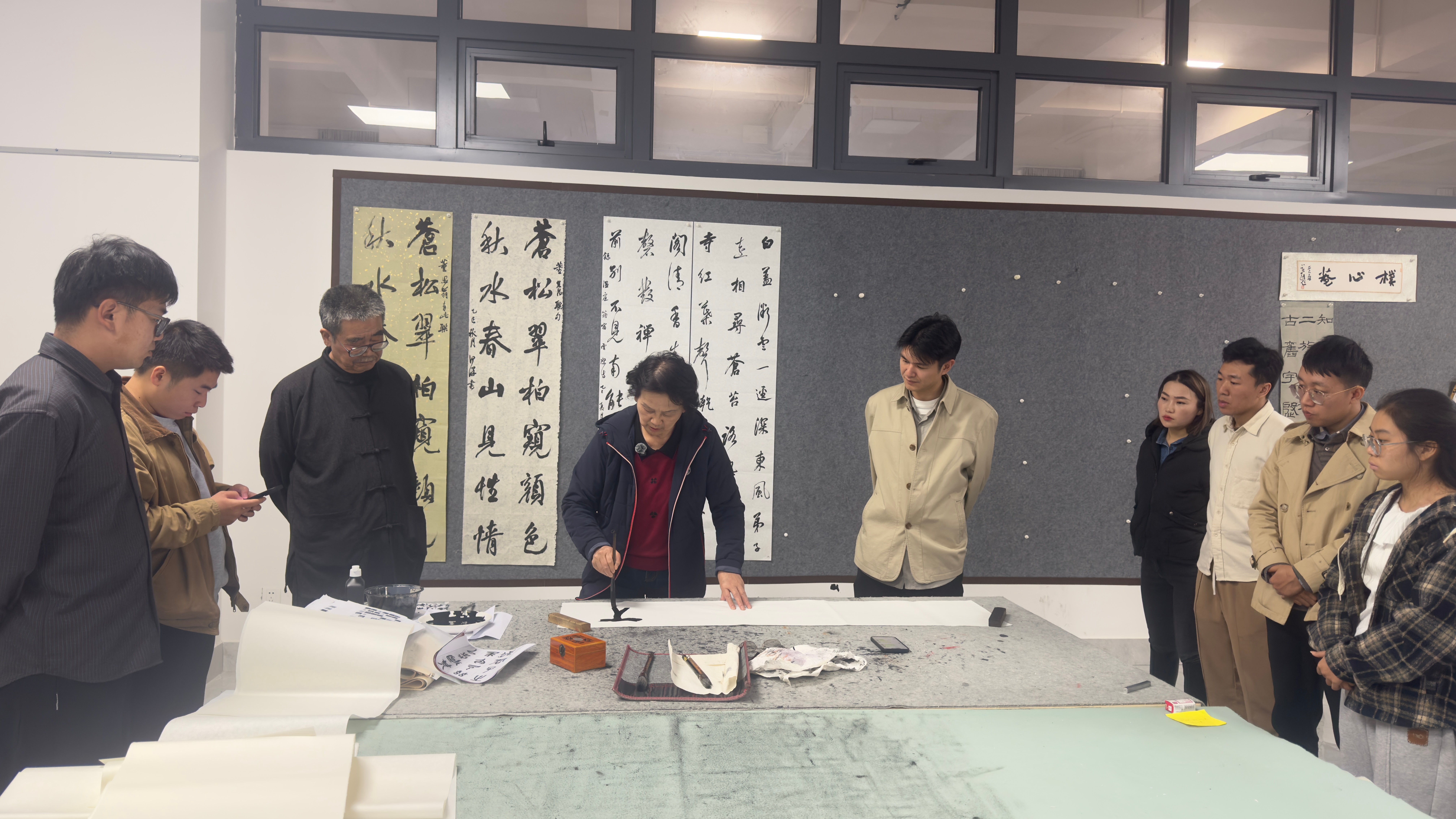 随后进行的笔会环节中,邱宗康现场以大篆创作横幅作品,充分展现其在章法布局与古文字运用方面的深厚造诣。教师们通过现场观摩学习,不仅汲取了宝贵的创作经验,更深刻认识到扎实的文字功底对于书法艺术表达的支撑作用。