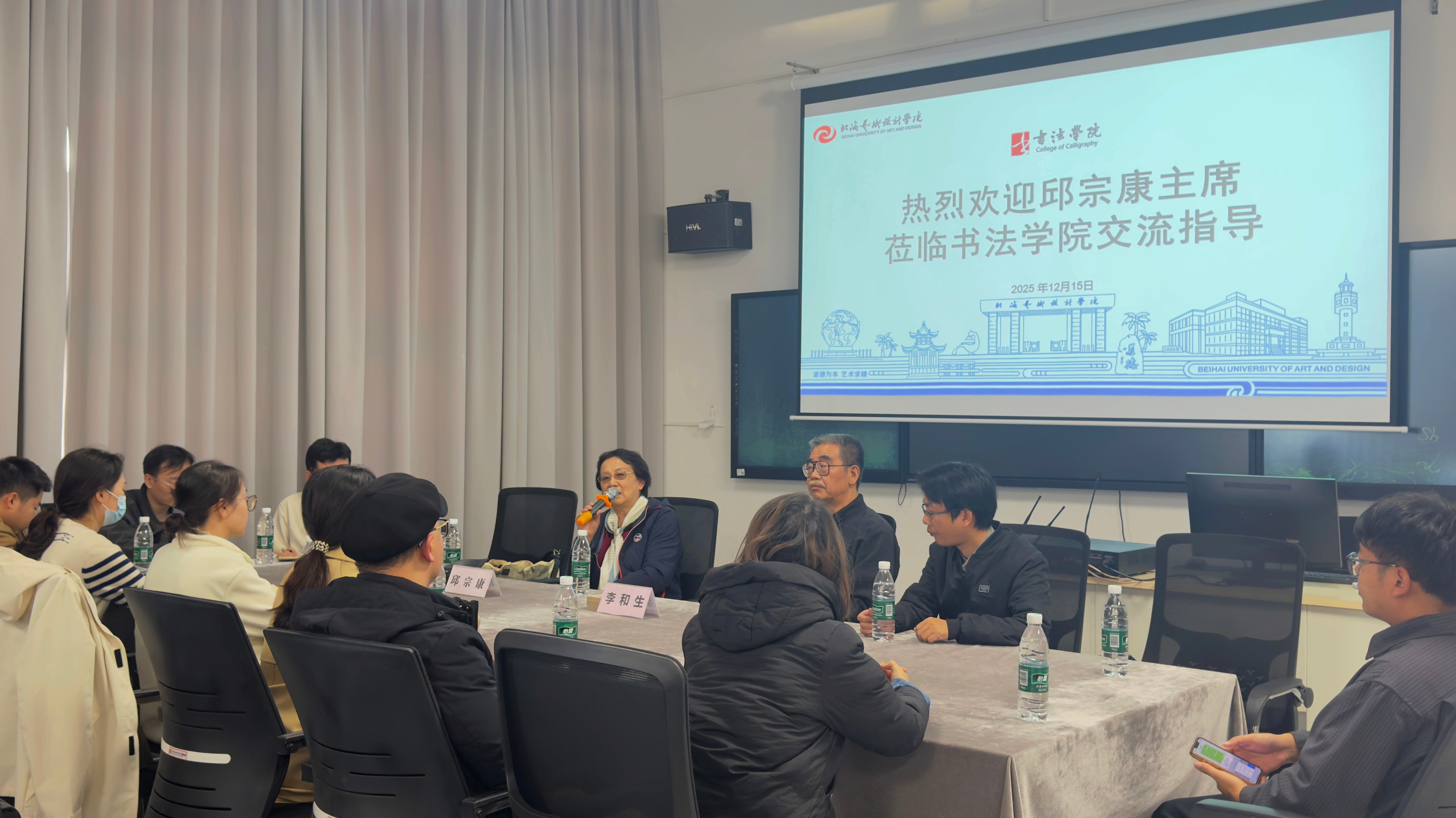 20251215午,院邀请国家一级美术师、中国书法家协会第六届理事、陕西省书法家协会第三届副主席兼秘书长、西安市篆书协会终身名誉会长邱宗康,以及西安市书法家协会第五届副主席、西安美术学院客座教授李和生来院,在艺德楼507书法教研室与教师代表开展书法交流活动。此次活动由书法学院常务副院长苏乃从主持,包含书法艺术座谈会和交流笔会两个环节。