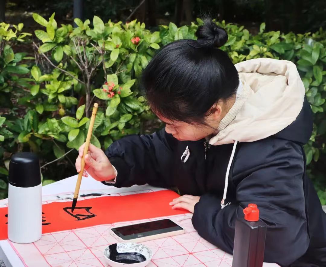 本次活动是由招募的志愿者人员进行现场书写春联,在寒风凛冽中每位志愿者紧握手中灼热的笔杆书写出对美好未来的憧憬与期盼。