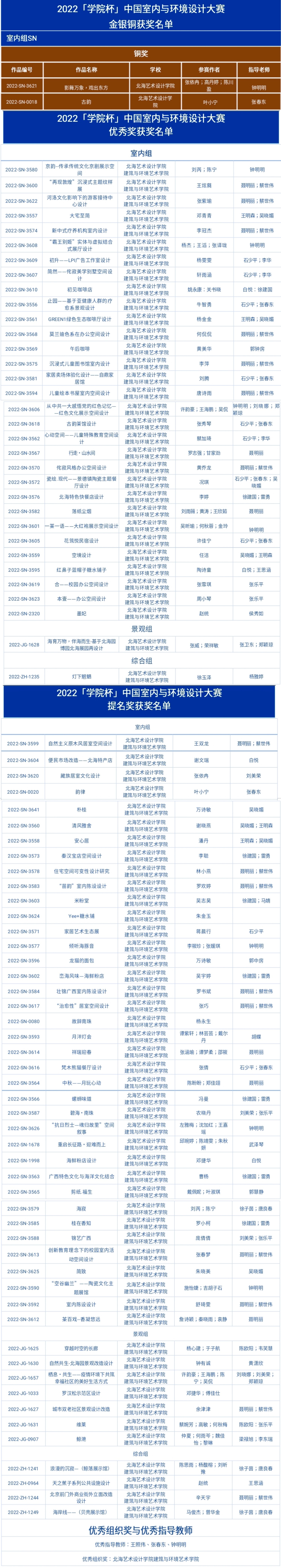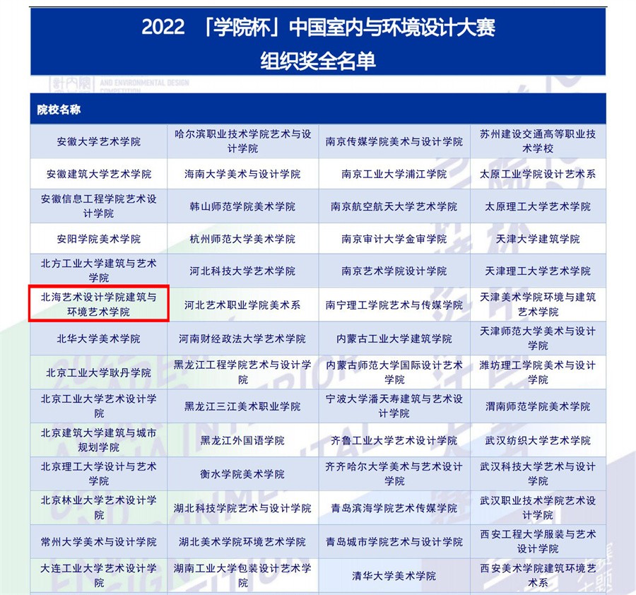 近日,2022学院杯“空间与叙事”中国室内与环境设计大赛圆满落下帷幕,经过激烈角逐,我校师生在终评中荣获优秀院校组织奖1项,室内组铜奖2项,室内组优秀奖31项,景观组优秀奖1项,综合组优秀奖1项,室内组提名奖38项,景观组提名奖7项,综合组提名奖4项,优秀指导教师3人的佳绩。