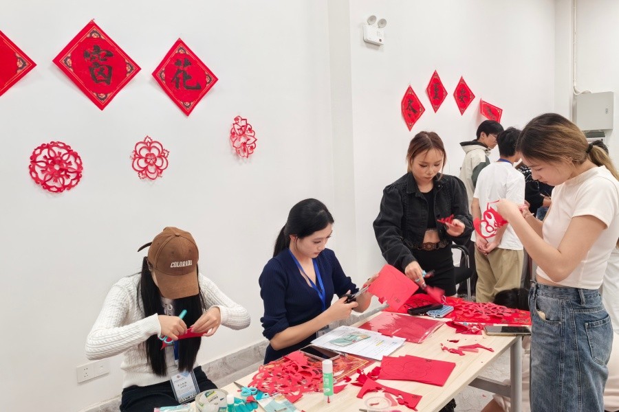 与此同时,传统文化体验活动同步开展。“写福字”区域内,师生挥毫泼墨,以笔墨寄情,一幅幅饱含祝福的福字承载着对新年的美好期许;“剪窗花”区域里,大家巧手翻飞,一张张红色纸张在指尖化作形态各异的吉祥图案,充分展现了民间传统艺术的生动魅力。现场特设的“转福轮”民俗知识问答环节,创新融合传统文化与现代互动形式,让师生在轻松愉悦的氛围中进一步深化对冬至民俗文化及各民族传统知识的认知与理解。