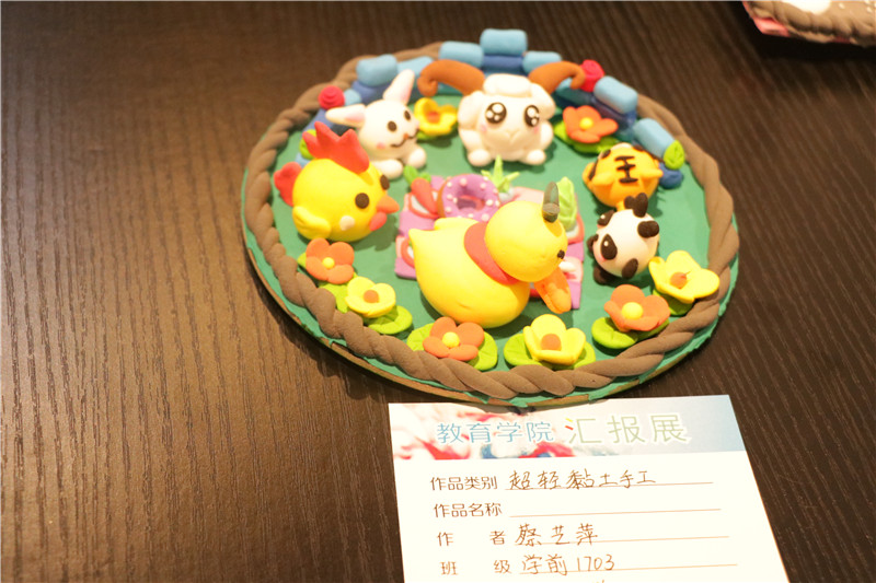 本次展览绘画部分主要包含国画、油画、水彩、儿童黑白画、插画以及顺石造型彩绘等;手工部分主要包括儿童拓印版画、纸浆画、玩偶缝纫制作、超轻黏土手工制作等。另外,还有学生原创的“本土玩偶”和“校园吉祥物”布偶系列设计制作。教育学院成立以来一直秉承“职业导向,德艺双修”的教育模式,始终强调专业建设的学术性、技术性、师范性。而艺术教育、学前教育的“准教师”们也深知未来要肩负的重任。这次的画展也正是基于这样的思考,在凸显学生专业技艺的同时,力图从形式上创新,从手法上丰富,凝聚了各位指导老师和同学们的智慧和心血。