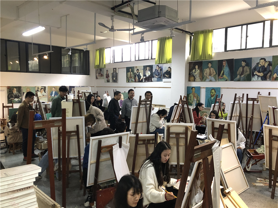 之后,美术学院常务副院长龚为、学工办主任袁志伟及美术学院绘画专业教师陪同计宇教授参观了绘画18级教学区,并进行教学指导。
