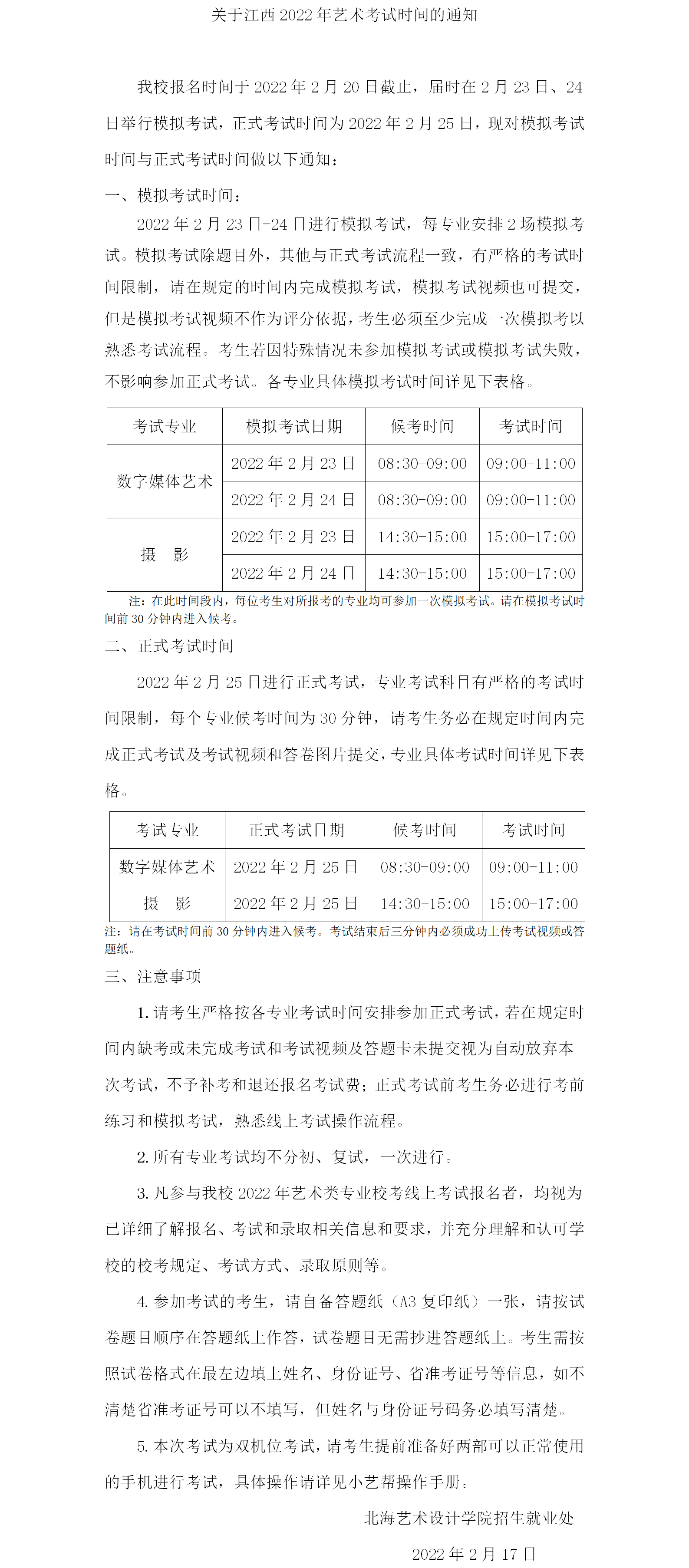 关于江西2022年艺术校考时间的通知